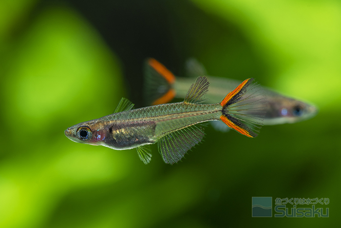 メコネンシスはミヌティルスやソンクラメンシスなどに比べると色彩的な性差が顕著です。オスは尾ビレの上下端の発色がメスよりも強く鮮やかで、状態によってその内側が黒くなる個体も多く見られます。また一部背ビレが赤みを帯びる個体もいます。また、オスはメスよりも背ビレやしりビレが発達し、成熟するとヒレの条が伸びてクシ状になることが多いですね。