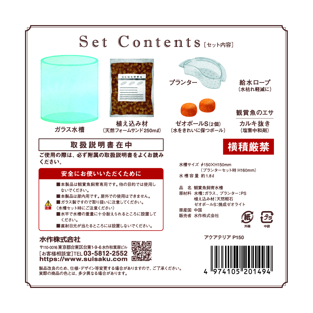 | セット内容 | ガラス水槽、植え込み材 250mL(天然フォームサンド)、 プランター、ゼオボールS 2個(水をきれいに保つボール)、 給水ロープ(水枯れ軽減に)、観賞魚のエサ、 カルキ抜き(塩素中和剤) ※生体、植物、底砂は含まれておりません。 |